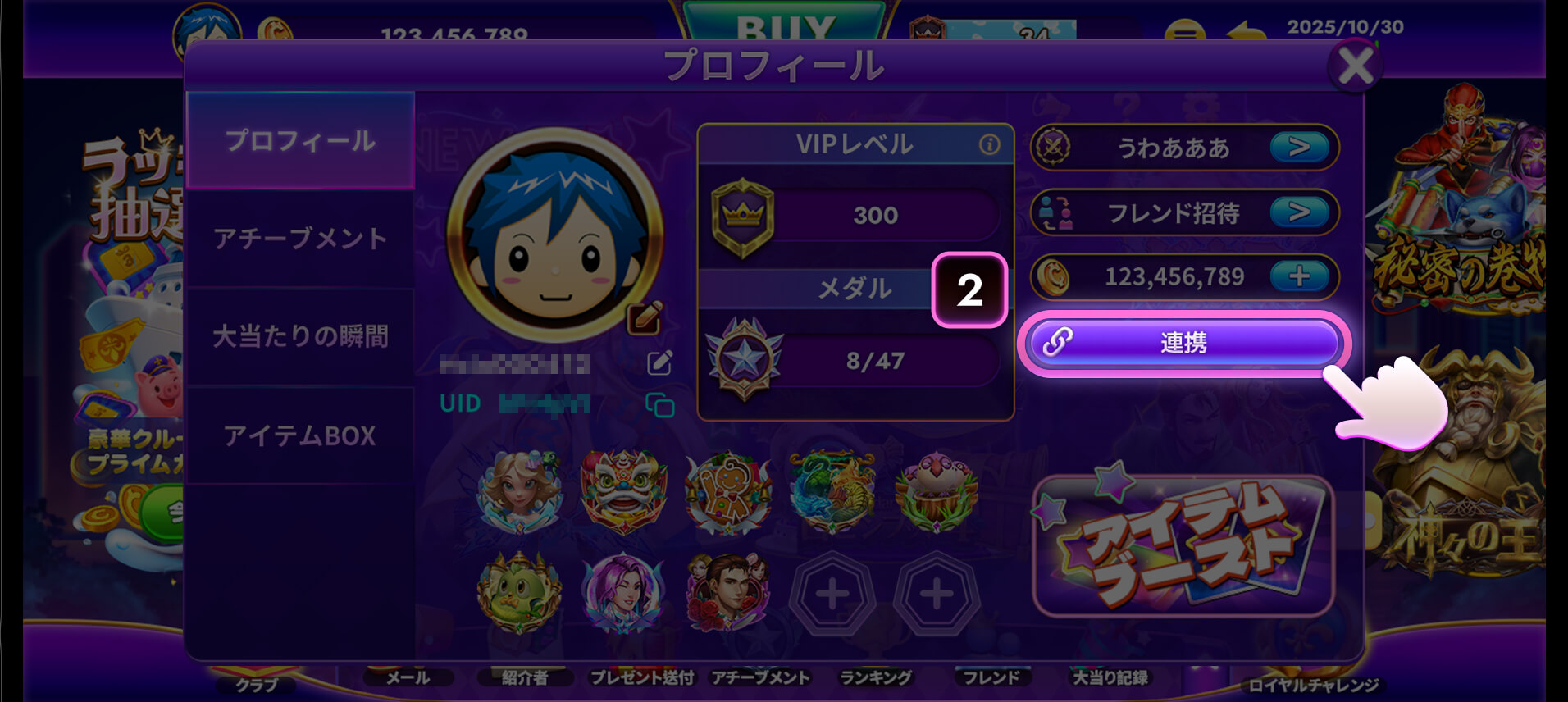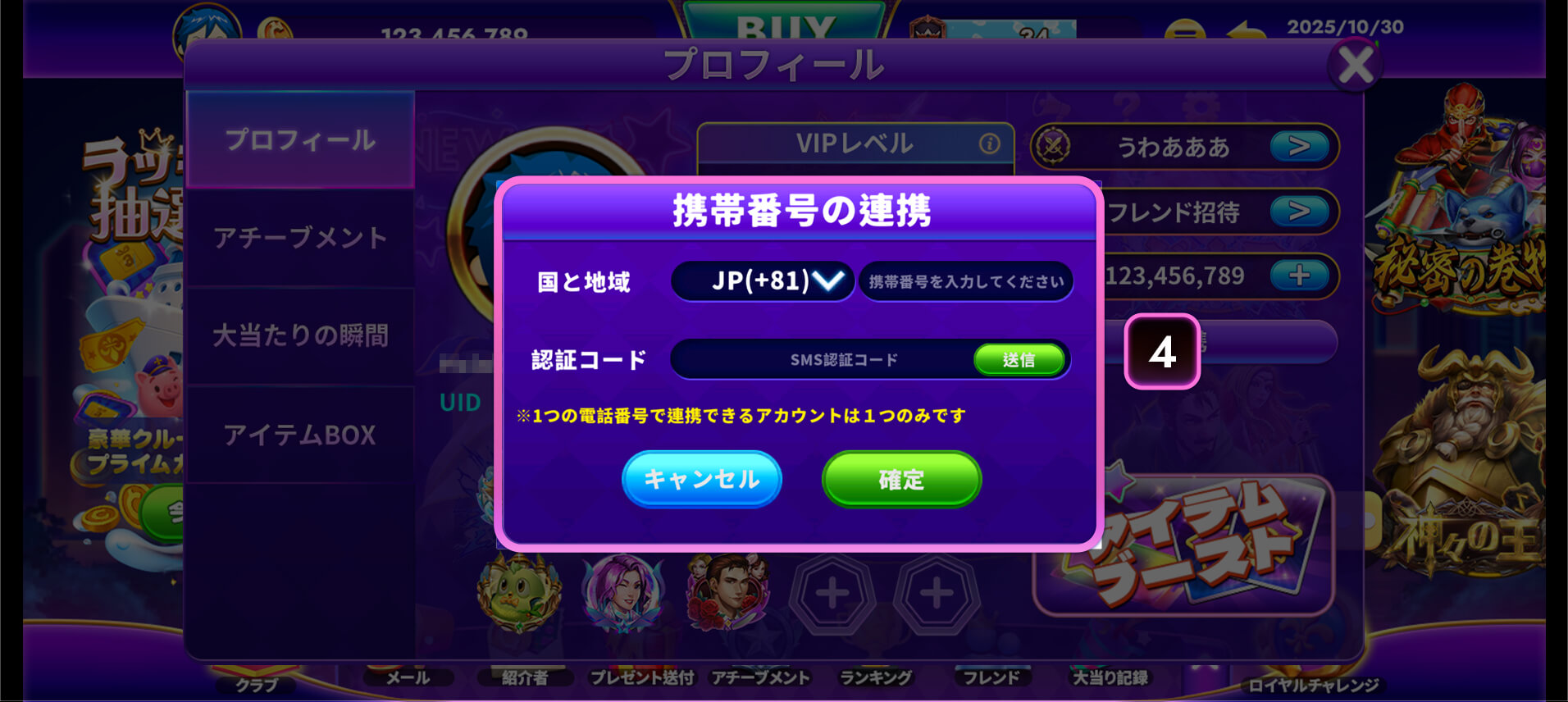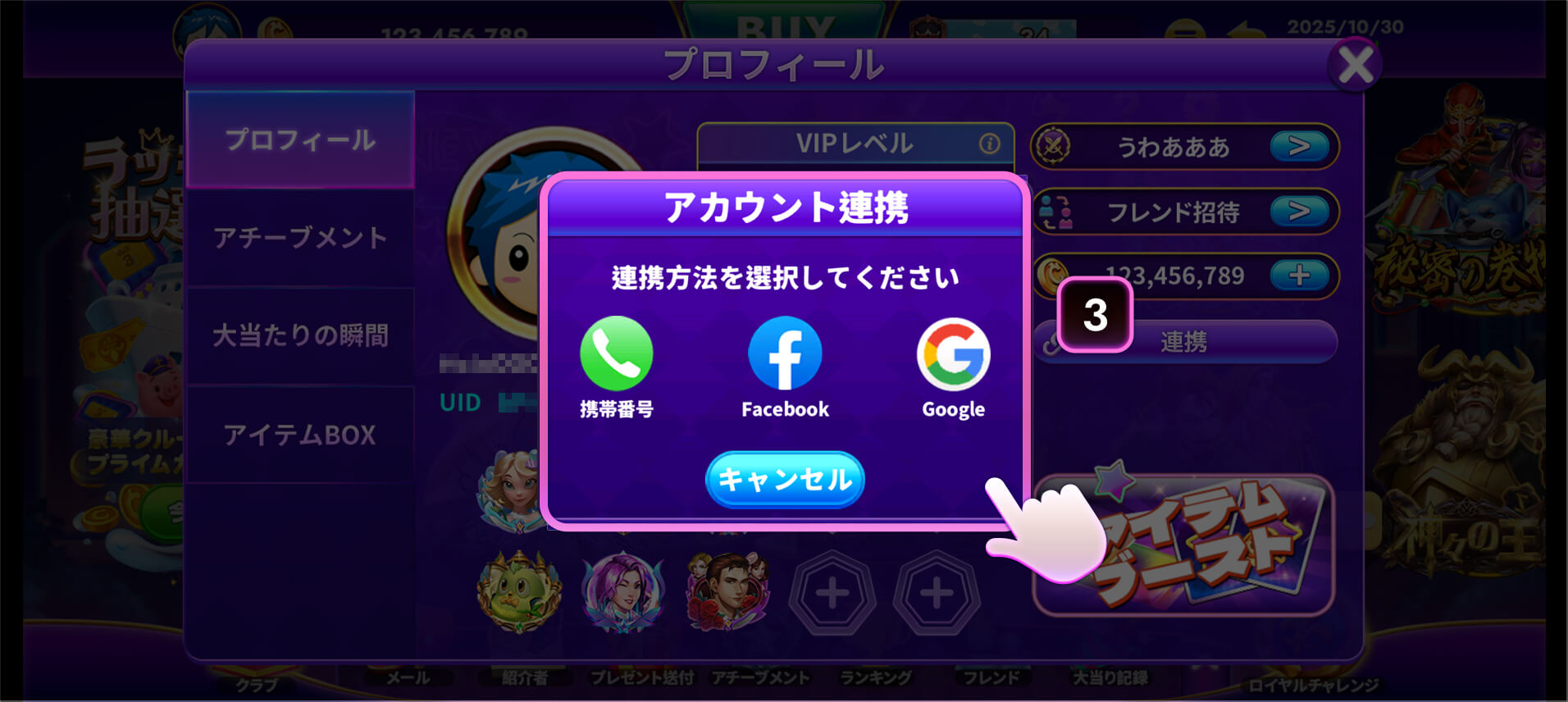 連携方法を選択します。ゲームキャラクターを携帯番号またはサードパーティアカウントと紐づけることができます。