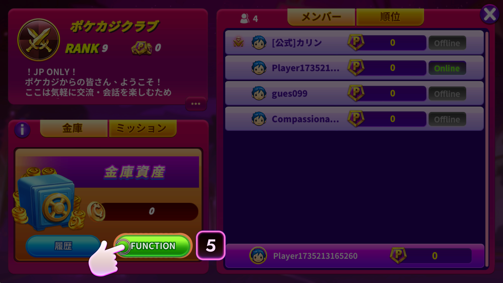 - 機能:クラブメンバーはクラブ金庫に寄付でき、クラブリーダーに資産の配分を依頼することも可能です!