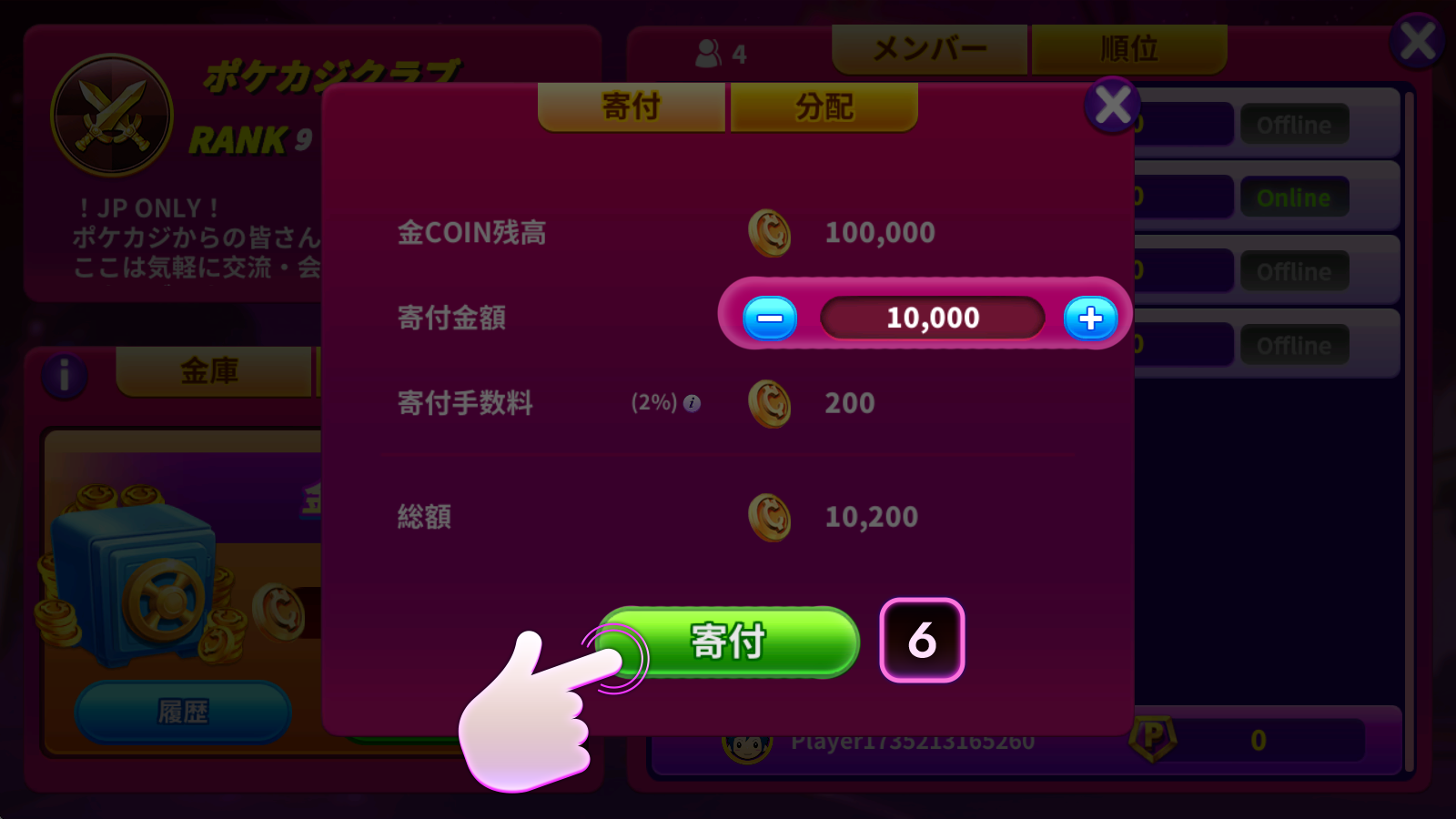 寄付:クラブメンバーは金Coinをクラブ金庫へ寄付できます。