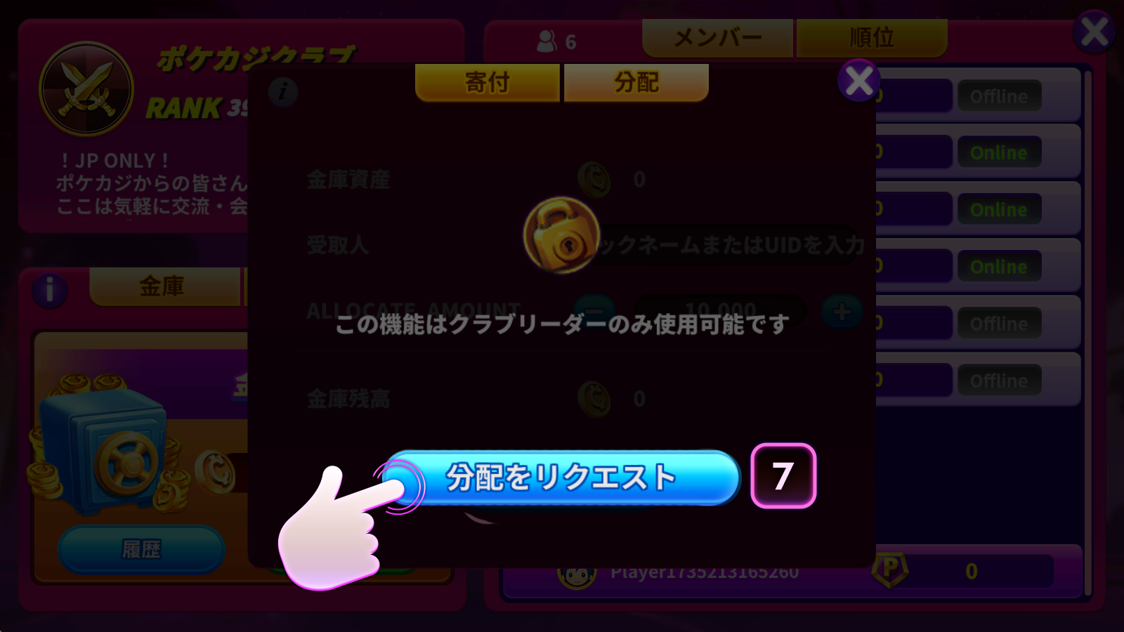 - 分配:クラブリーダーおよびサブリーダーは金庫資産を管理し、任意のメンバーに分配できます。メンバーは【分配をリクエスト】をタップしてクラブリーダーに分配依頼を送ることができます。