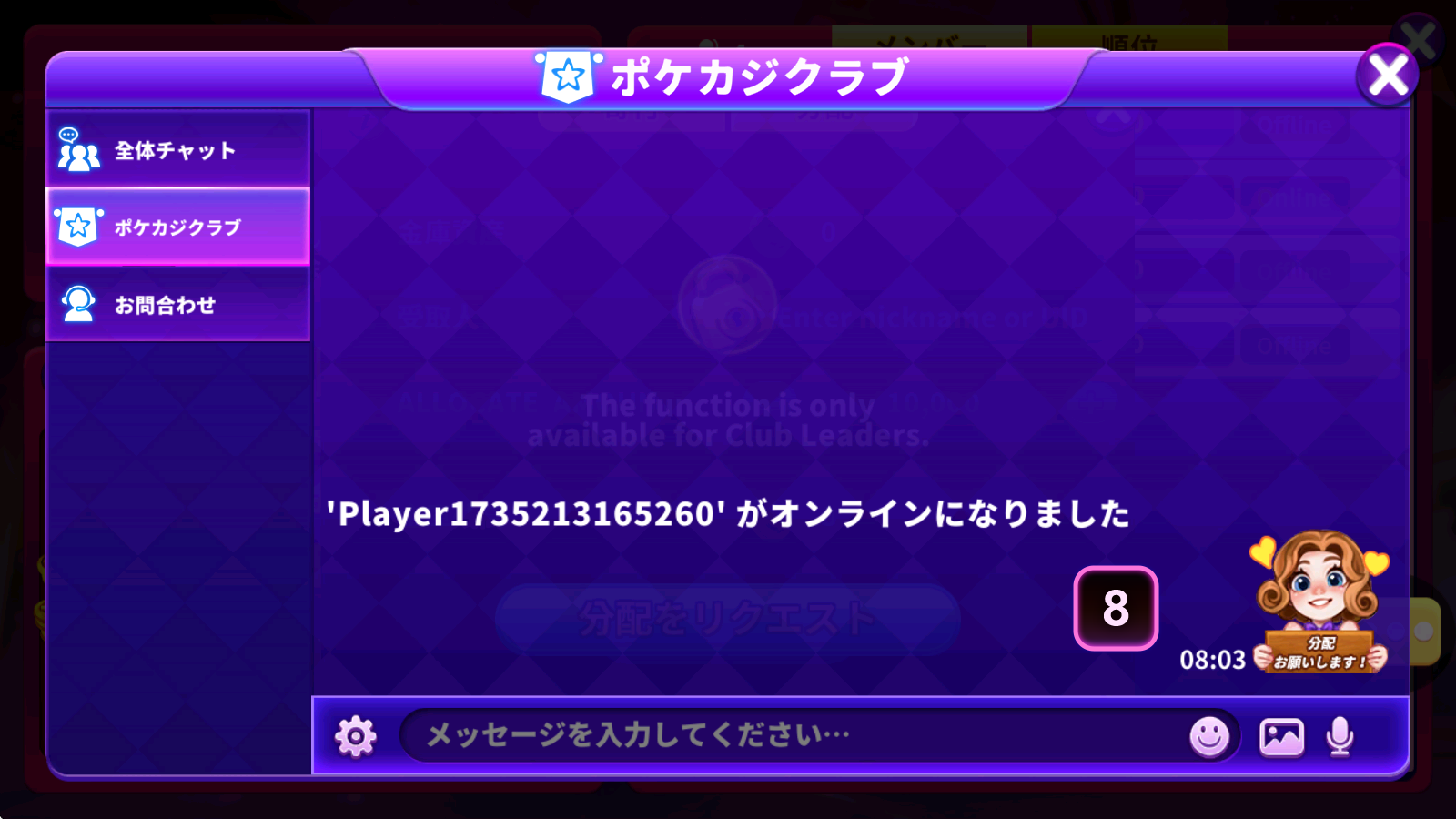 - 分配をリクエスト:スタンプがすぐクラブチャットに送信されます。